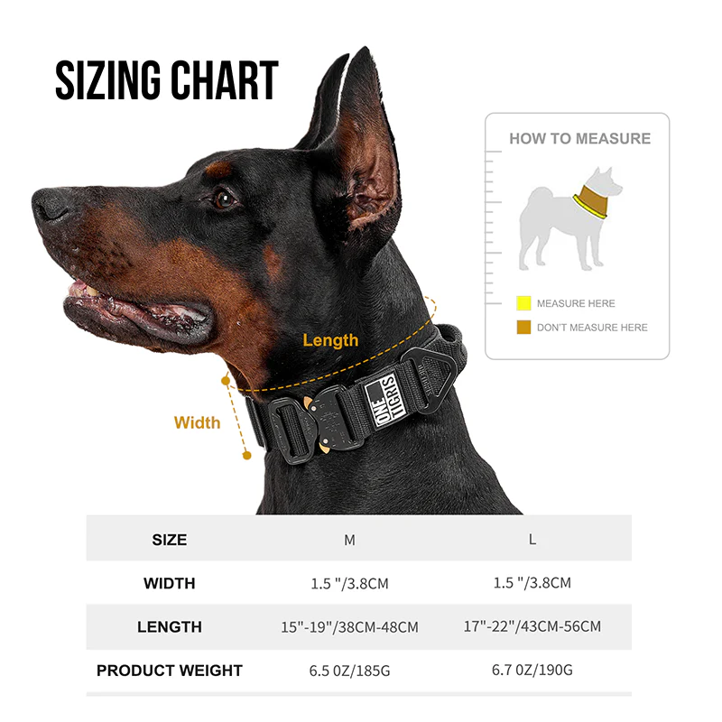 - ADJUSTABLE FIT ā Available in M (15ā19ā³) and L (17ā22ā³), this adjustable dog collar provides a secure and comfortable fit for a range of dog sizes